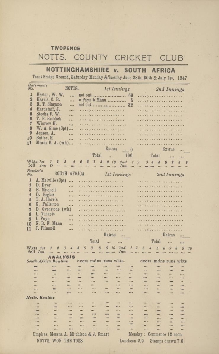 NOTTINGHAMSHIRE V SOUTH AFRICA 1947 CRICKET SCORECARD