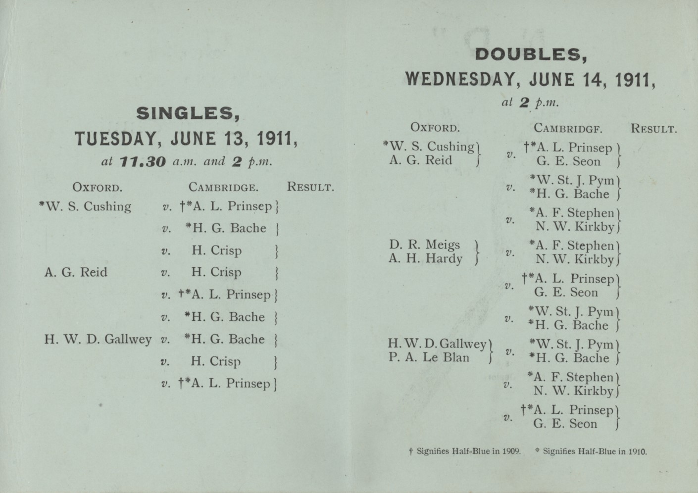 Official programme for the Oxford v Cambridge lawn tennis match played at Fenner's on June 13-14, 1911. All the singles players appeared around that time at Wimbledon, including Hope Crisp, the first winner of the Mixed Doubles at Wimbledon in 1913, and Harold Bache, the Worcestershire cricketer and famous amateur footballer for Corinthian FC, West Bromwich Albion and England. Bache was killed by a sniper in West Flanders in 1916.