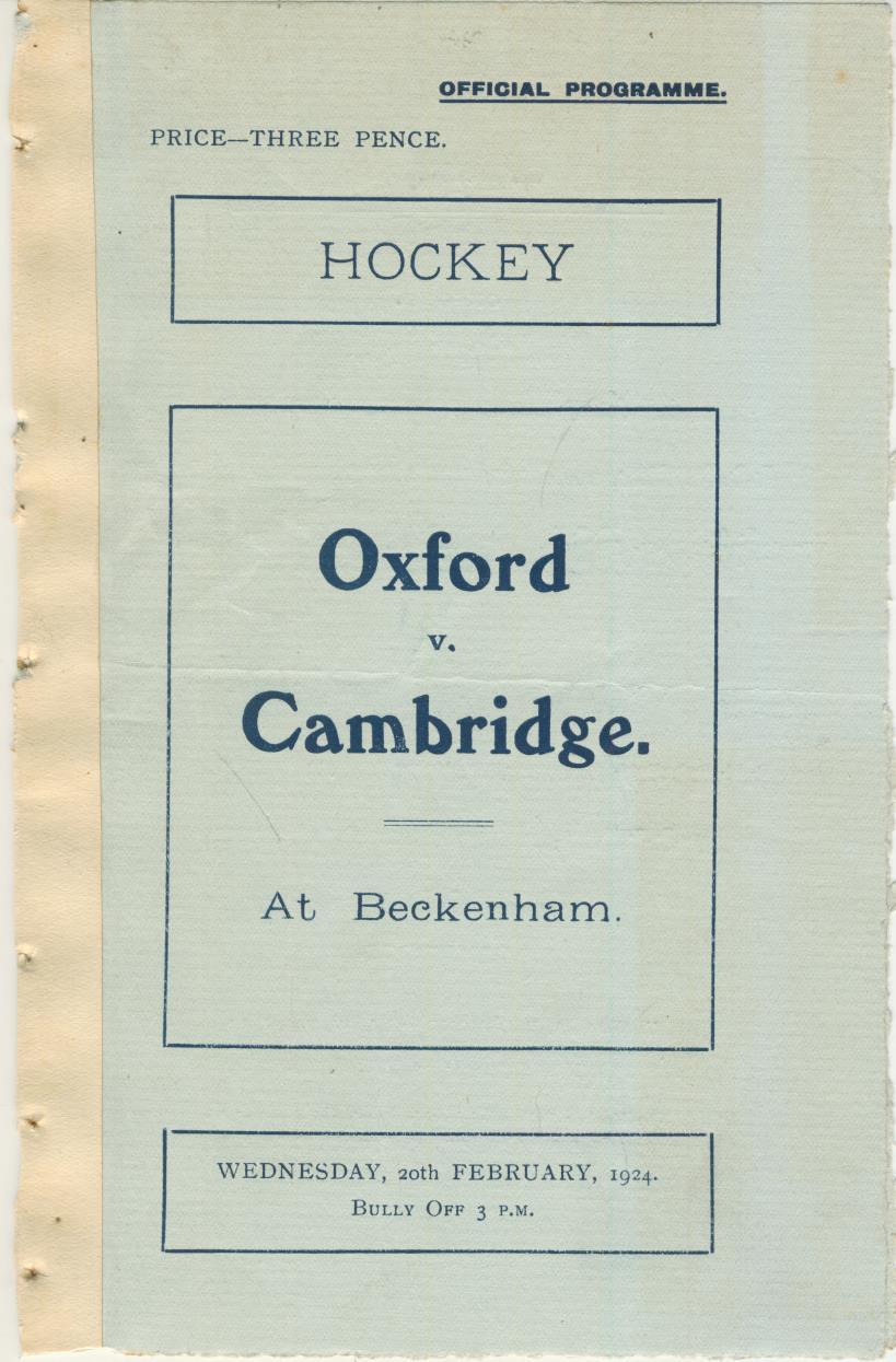 Official programme for the hockey match between Oxford and Cambridge, played at Beckenham on February 20th 1924. The Oxford team included Jaipal Singh, who captained the 1928 Indian Olympic Champions.