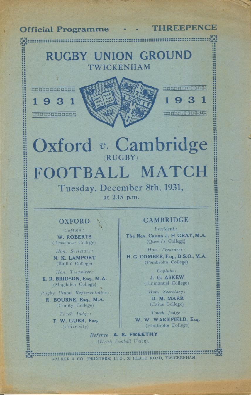OXFORD V CAMBRIDGE 1931 RUGBY PROGRAMME