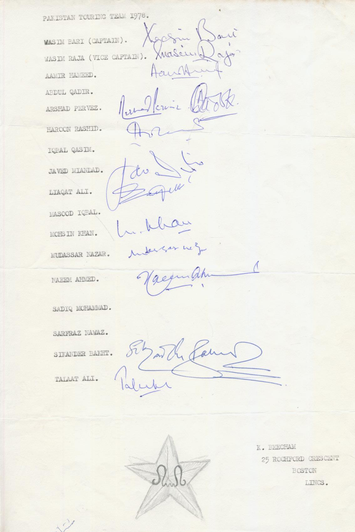 Autograph sheet for the Pakistan cricket tour to England in 1978. Signed by 13 members of te squad, including Wasim Bari, Wasim Raja, Qadir, Javed Miandad, Mohsin and Sikander Bakht. Seems to be an unofficial sheet printed by the autogtraph collector. Pencil sketch of the Pakistan cricket crest underneath autographs.