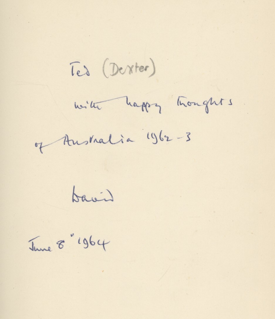 8vo. 253pp. 10 pages of photographs. Dust-wrapper, lightly rubbed. Very good. Signed and dedicated by Sheppard to fly-leaf to Ted (Dexter) "with happy thoughts of Australia 1962-63" and dated 1964. The two had been rivals for the captaincy of the tour, with Dexter finally chosen to lead - the series was drawn 1-1.