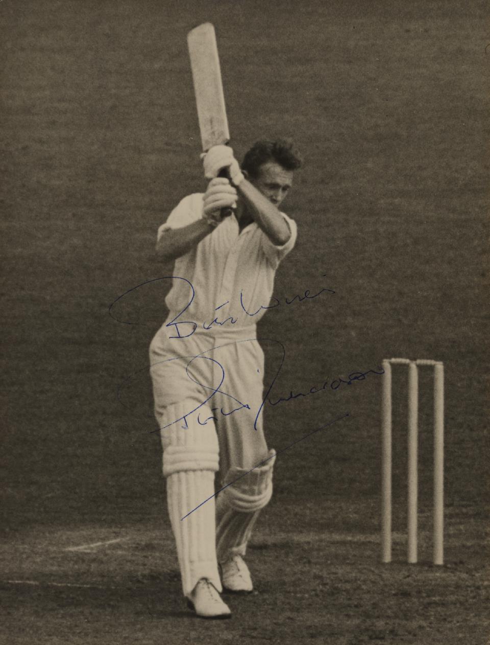 Original Press photograph of Richardson batting during the first Test of the 1956 Ashes series at Trent Bridge. He top scored in England's first innings with 81.
