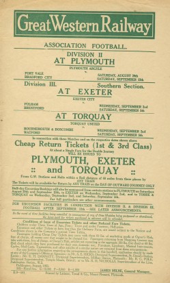 Great Western Railway handbill, advertising cheap reurn tickets to Plymouth, Exeter and Torquay to see football matches in late August/early September 1931. The teams travelling down to the South West include Port Vale, Bradford City, Fulham, Brentford, Bournemouth & Boscombe and Watford.