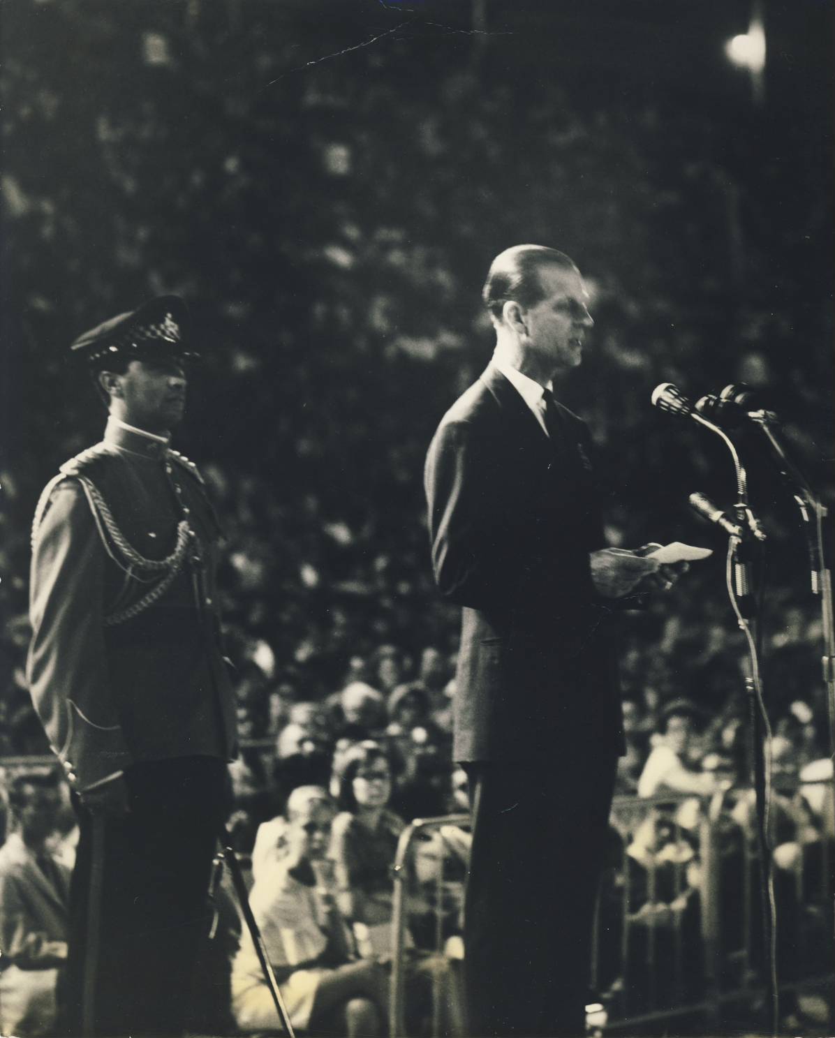Original Press photograph of HRH The Duke of Edinburgh giving the Opening Address at the 1966 British Empire and Commonwealth Games in Kingston, Jamaica. This was the first time that the Games had been held outside the so-called "White Dominions." After 1966 the "British Empire" title was dropped and they became the Commonwealth Games.