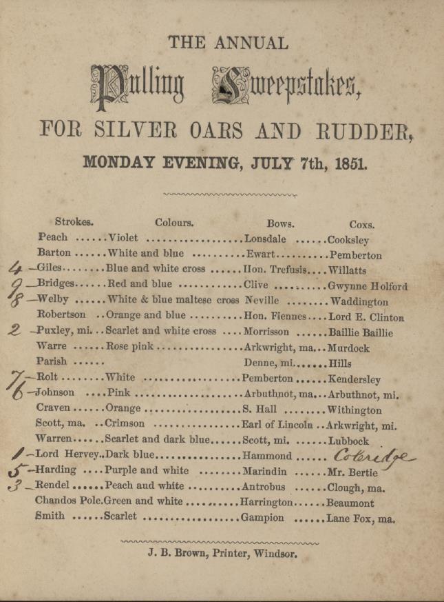 Official programme (rare) for the Pulling Sweepstakes held on 7th July 1851 for Silver Oars and Rudder. Lord Hervey, Hammond and Coleridge won the race (if the handwritten annotations in ink are accurate). Printed by J.B. Brown of Windsor.