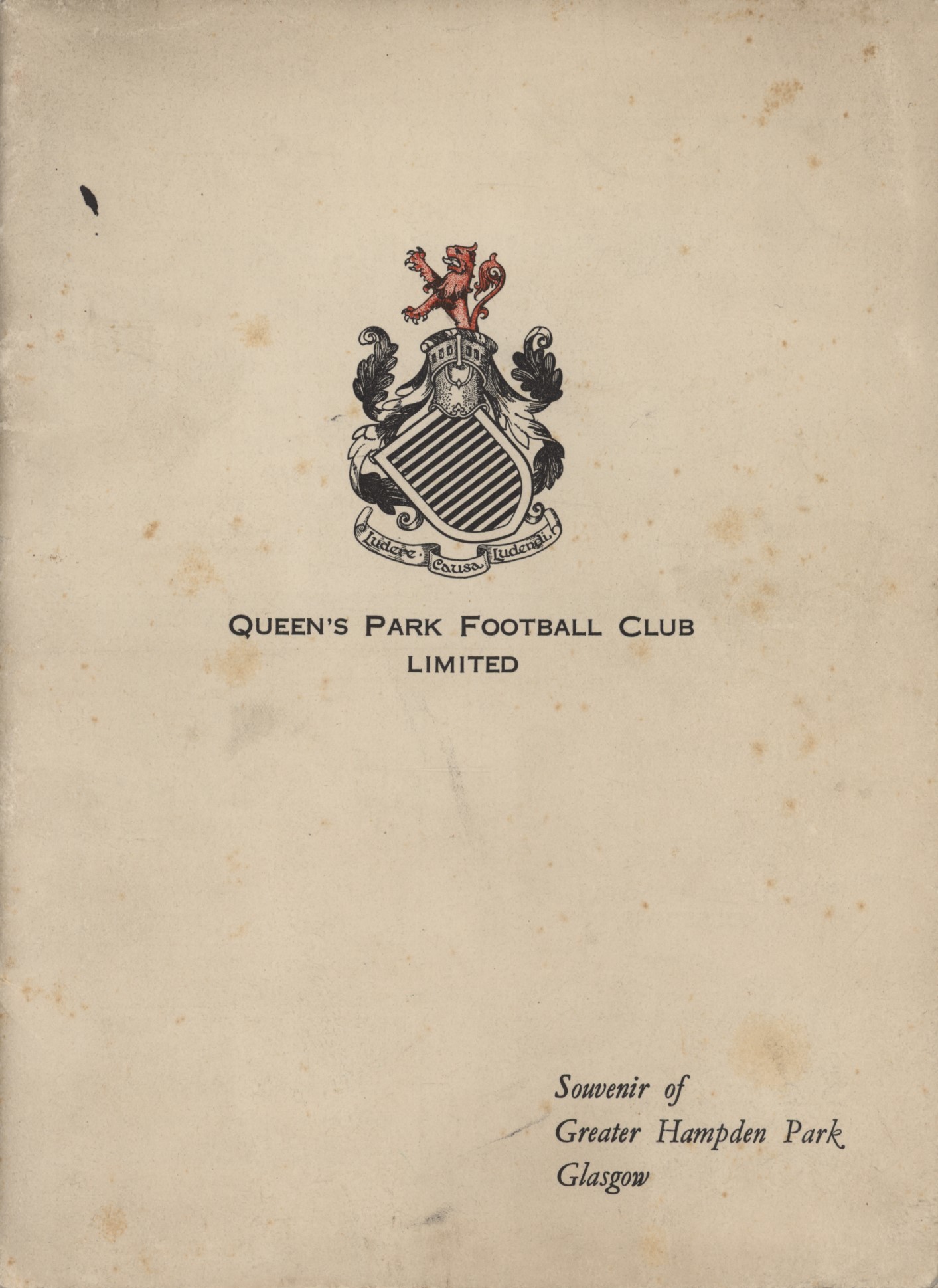 Souvenir brochure, containing a history of the ground, which was the home of Queen's Park FC since 1903 and the national stadium for many years. Contains many internal pictures of changing rooms, boardroom, reading room, etc, but perhaps most notable for its large fold out plans in the rear showing every seat in this huge ground.