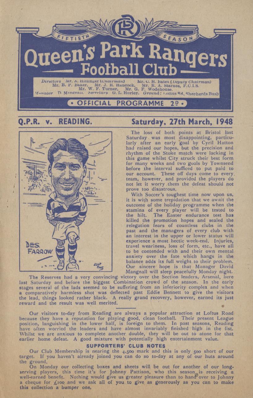 QUEEN'S PARK RANGERS V READING 1947-48 FOOTBALL PROGRAMME