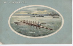 Rowing postcard. Illustration of a rowing eight with the legend "MY FAVOURITE"  by W&A of London,  circa 1907. Postally used and stamped 1907, with handwritten message in ink on reverse. Minor damage to bottom left corner. In good condition.