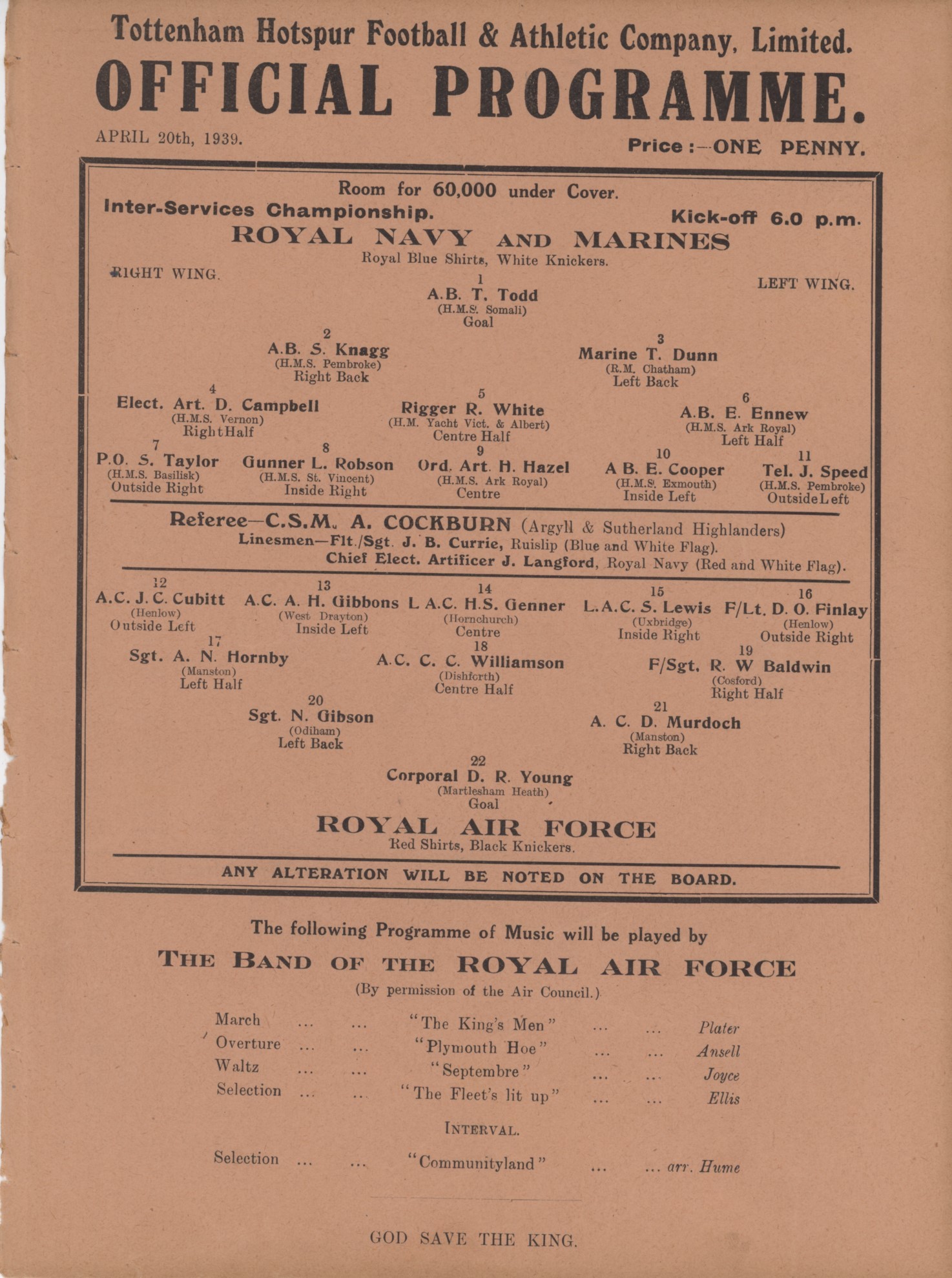 ROYAL NAVY AND MARINES V ROYAL AIR FORCE (WHITE HART LANE) 1938-39 FOOTBALL PROGRAMME
