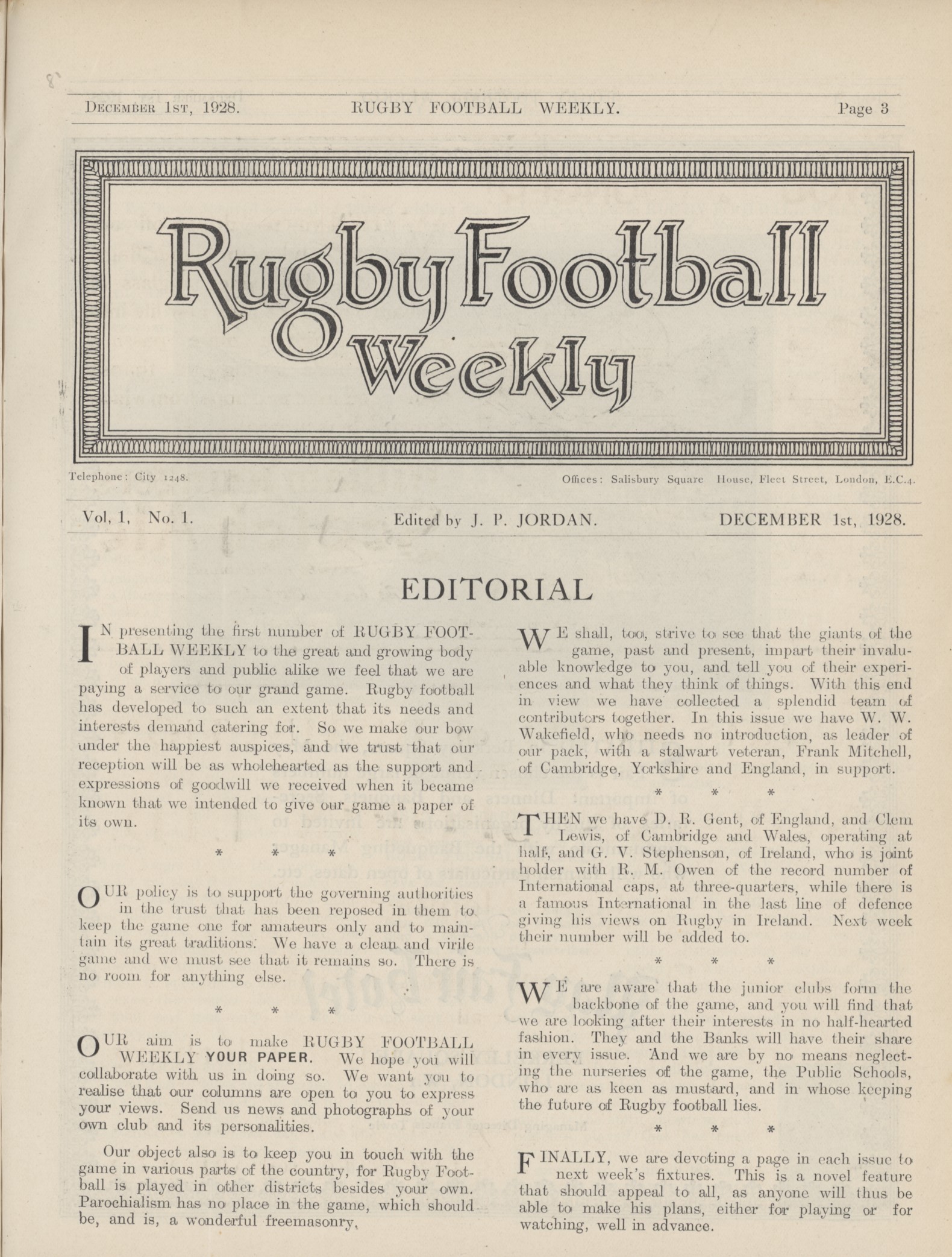 Nicely bound full set of the rugby magazine's first volume, nos.1-22 (1 December 1928 - 27 April 1929), featuring articles, fixtures and match reviews, with photographic illustrations and cartoons. Original covers of each magazine are not retained.