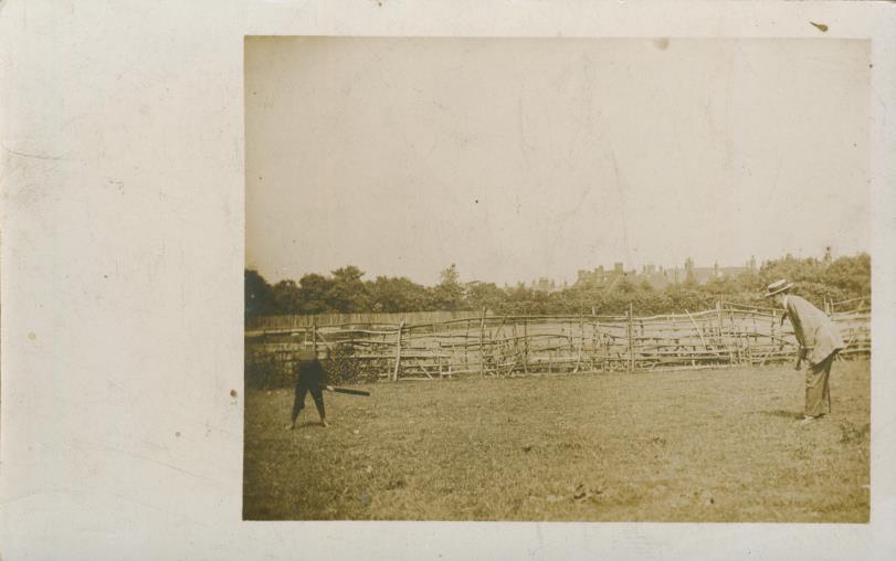 Cricket postcard. Real photograph of a father and son playing cicket in a rural setting. Early 20th century. Postally unused. Pencil mark to reverse. Very good.
