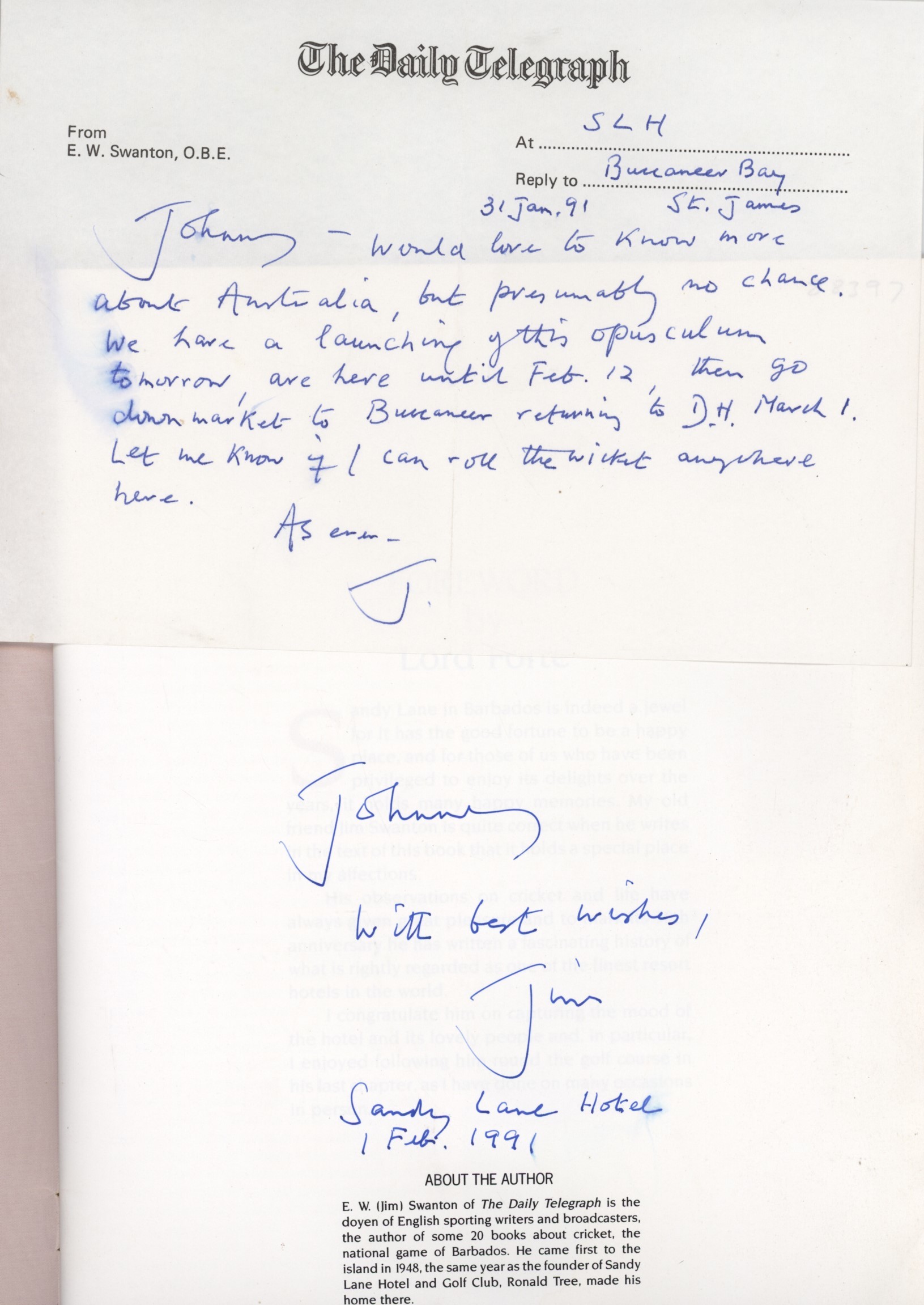 Paperback. 4to. 32pp. Minor wear and buckling to covers. Good condition. Signed and dedicated to first page by Swanton to his friend and fellow cricket journalist John Woodcock, dated February 1st 1991. A note on Daily Telegraph headed paper from Swanton to Woodcock is also slipped in, referring to this publication and to the Ashes tour going on at the time. Smudge to note.