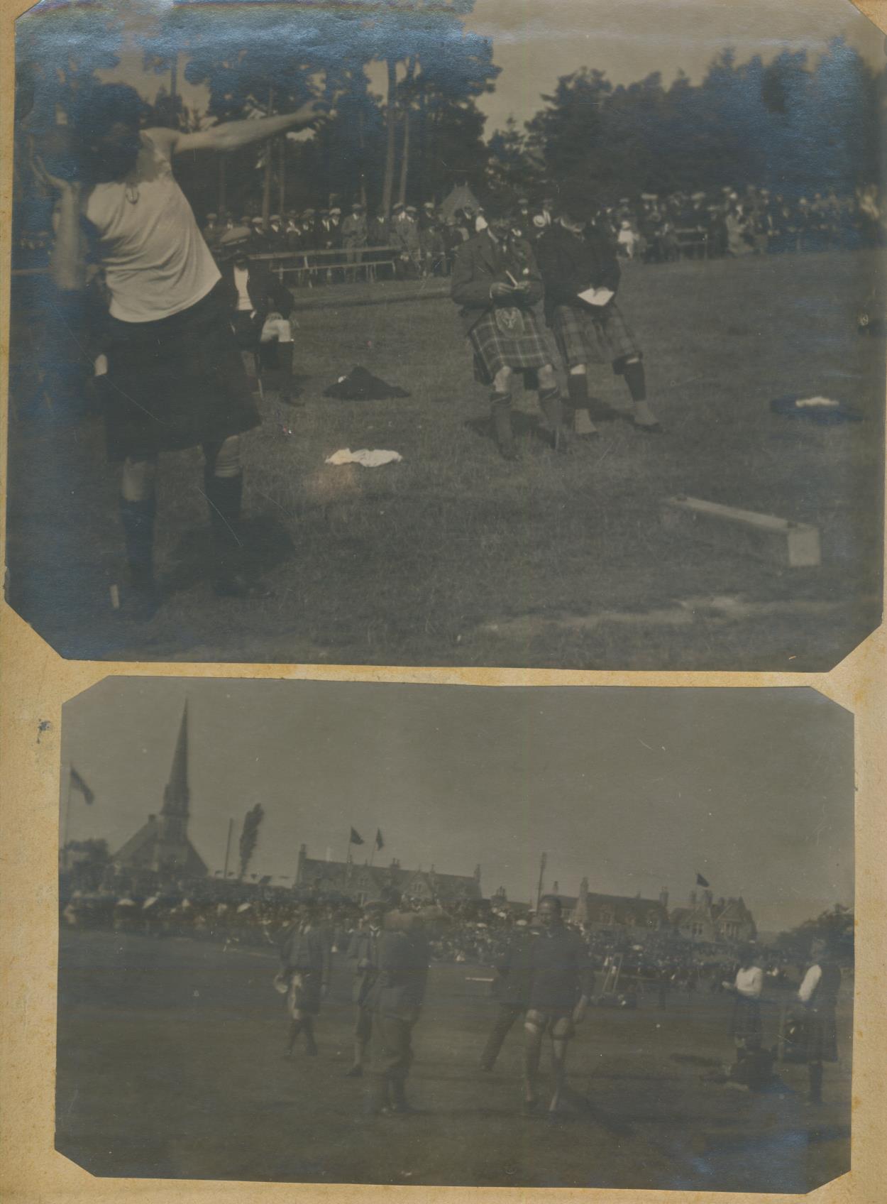 Nicely assembled scrapbook with newspaper and magazine cuttings describing Scottish wrestlers and some other sports (including Highland Games), from 1904-1930s. Two early photographs of Highland Games are pasted to inside cover - both are a little dark.