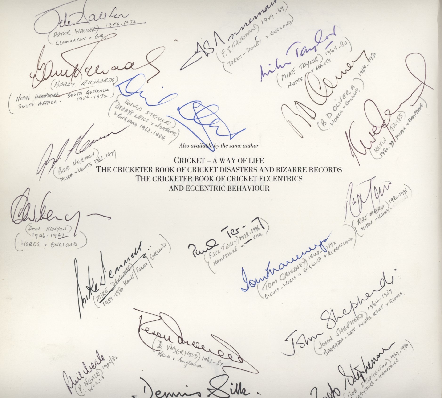 Square 4to. 224pp. Dust-wrapper, very good. Signed to title-page and opposite by 40 players and related figures, including Malcolm Marshall, Amiss, Gooch, Statham, Martin-Jenkins, Underwood, Denness, D'Oliveira, Trueman, Barry Richards, David Steele, Kenyon, Silk, Graveney, Paul Terry, Jesty, Robin Smith, Coverdale, Randall, Cottam, Mike Procter, Gower, Tremlett, Jack Potter, Jameson, Insole, John Woodcock, Tom Cartwright, Holder, Ayling, Shackleton, Baldry, Mike Taylor, James, Maru, John Shepherd, Neale, Herman, Peter Walker and Bob Stephenson.