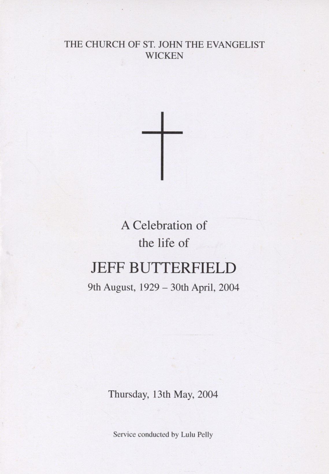 Order of service pamphlet for the memorial service of Jeff Butterfield, held in Wicken on May 13th 2004. Butterfield played rugby for England and the British Lions through the 1950s.