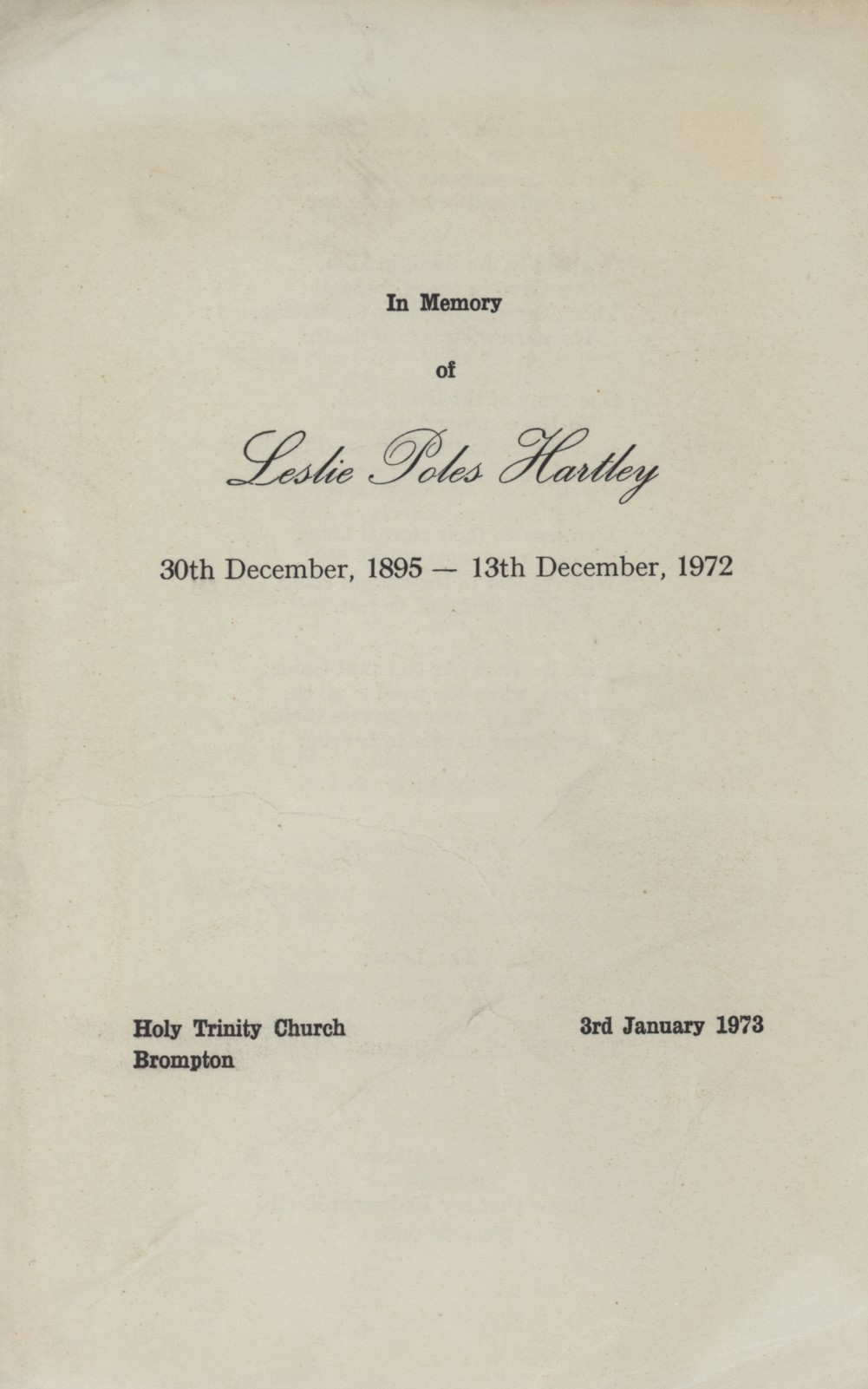 Order of service for the memorial service held for the author Leslie Poles Hartley at Holy Trinity, Brompton, on January 3rd, 1973. Hartley wrote an acclaimed account of a cricket match in his most famous work, The Go Between. Many relevant Press cuttings slipped in.