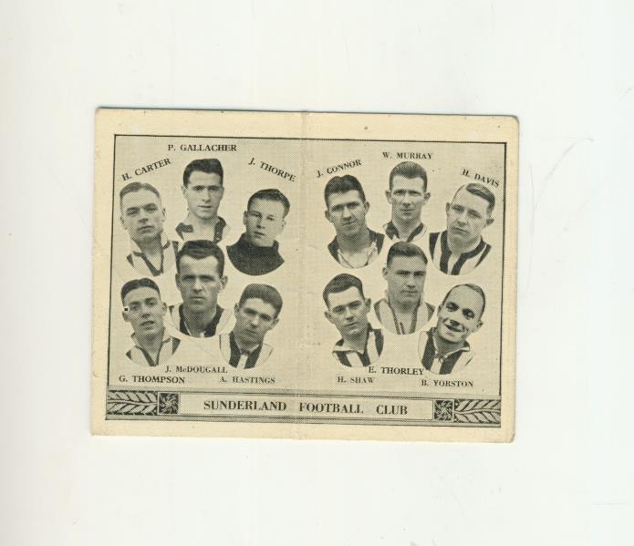 Hinged, double-sided collector's card, issued by Barratt c1930, showing head-and-shoulder images of the Sunderland players of the day. On the back is a potted history of the club.