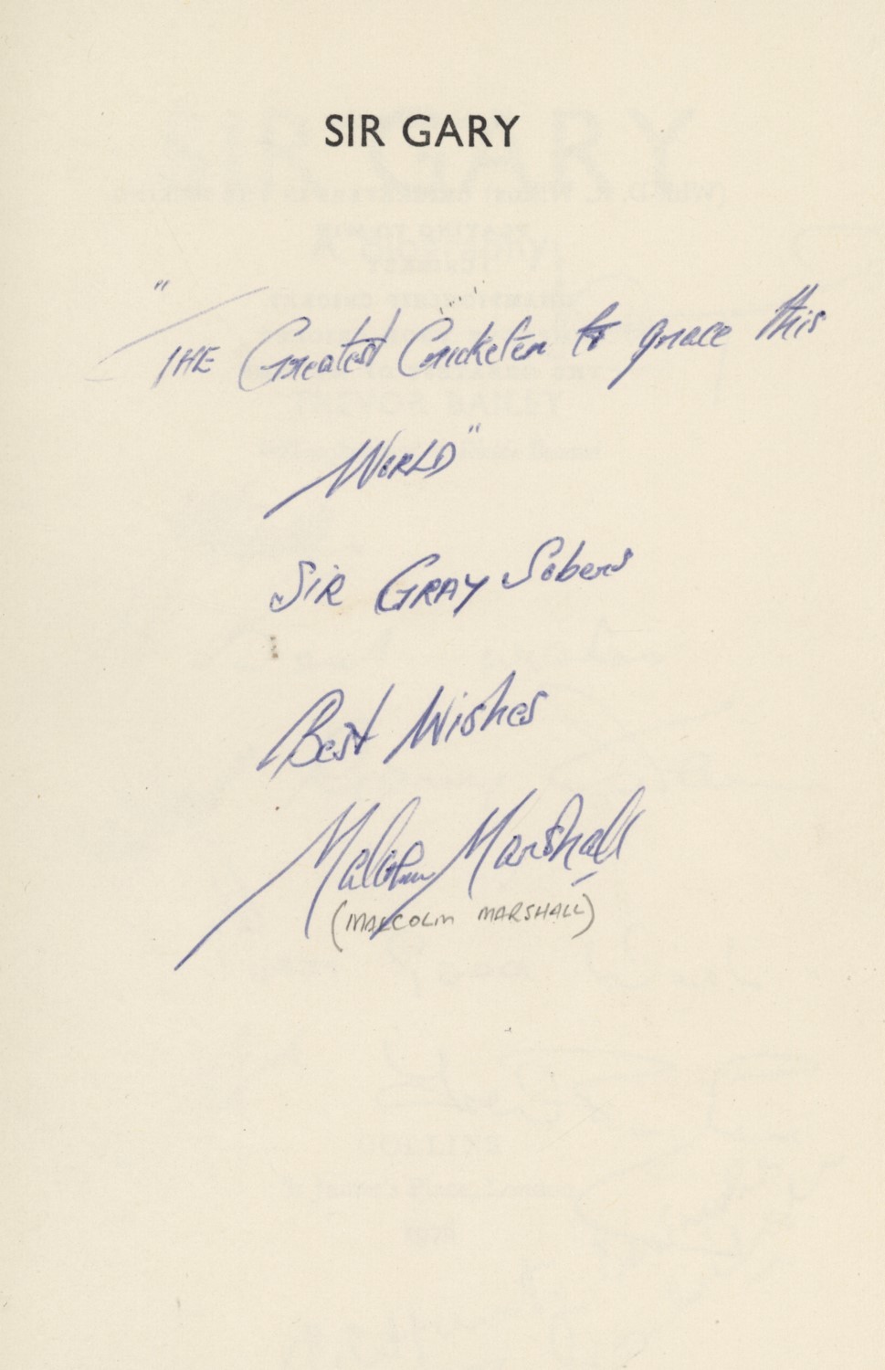 8vo. 190pp. 16 pages of photographs. Owner's small labels to front pastedown. Dust-wrapper, lightly rubbed. Very good. Signed nicely to title page by Gary Sobers, Trevor Bailey (the author), Desmond Haynes, Joel Garner, Malcolm Marshall, Conrad Hunte, Vanburn Holder and David Holford. Malcolm Marshall has also signed the half title-page with the inscription "The Greatest Cricketer to grace this world - Sir Gray (sic) Sobers. Best wishes. Malcolm Marshall".