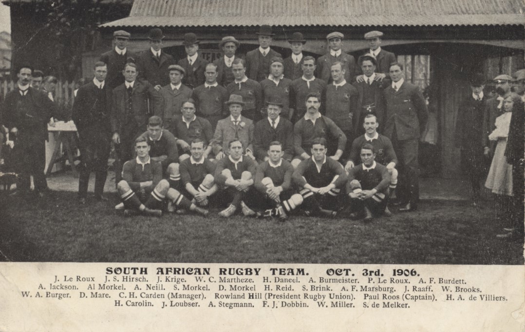 Rugby Union postcard. Real photograph by Gordon Smith of London of the South African side that beat Kent on the 3rd of October 1906. This was the first overseas tour by a South African rugby team and it was during this tour that the term 'Springboks' was coined. Postally unused. Small tear and some light creases to edges. Good condition.