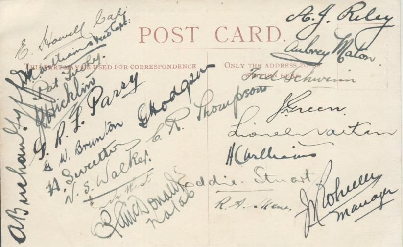 Postcard of the Union-Castle Line "Kenilworth Castle", the boat that brought the 1924 South African football team to England. They played their very first international match against Ireland on this tour. Signed to the back by the full touring party, including Gordon Hodgson, who went on to play for Liverpool and England, as well as cricket for Lancashire.