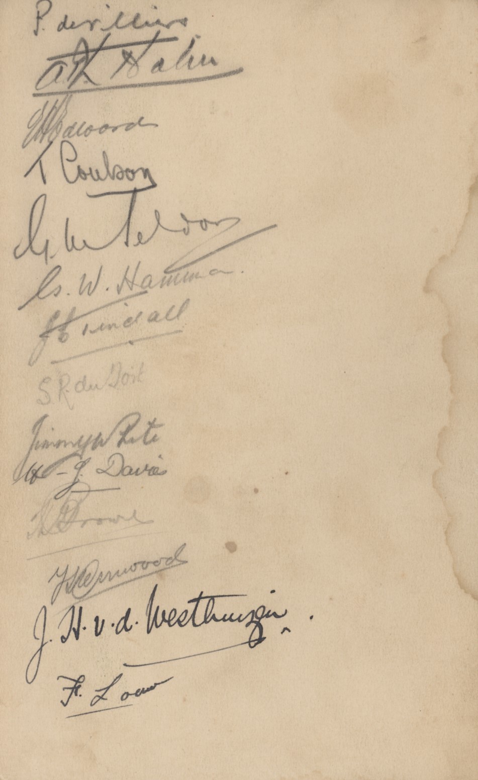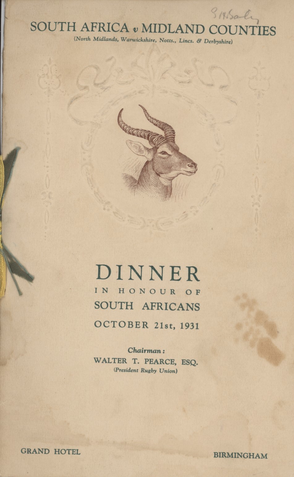 Menu card for a dinner held in honour of the South Africans at the Grand Hotel, Birmingham on 21 October 1931, after a match against the Midland Counties. Embossed decoration and original ribbon still in tact. Signed on the back cover in pencil and ink by 14 players from both teams, including P de Villiers, SR de Toit, J White, JC Tindall, JH van der Westhuizen (ink) and SC Louw (ink) of South Africa. The other signatures include T Coulson, the captain of the Midland Counties team. From the collection of the Cambridge blue G.H. Bailey, with his pencil signature to front.