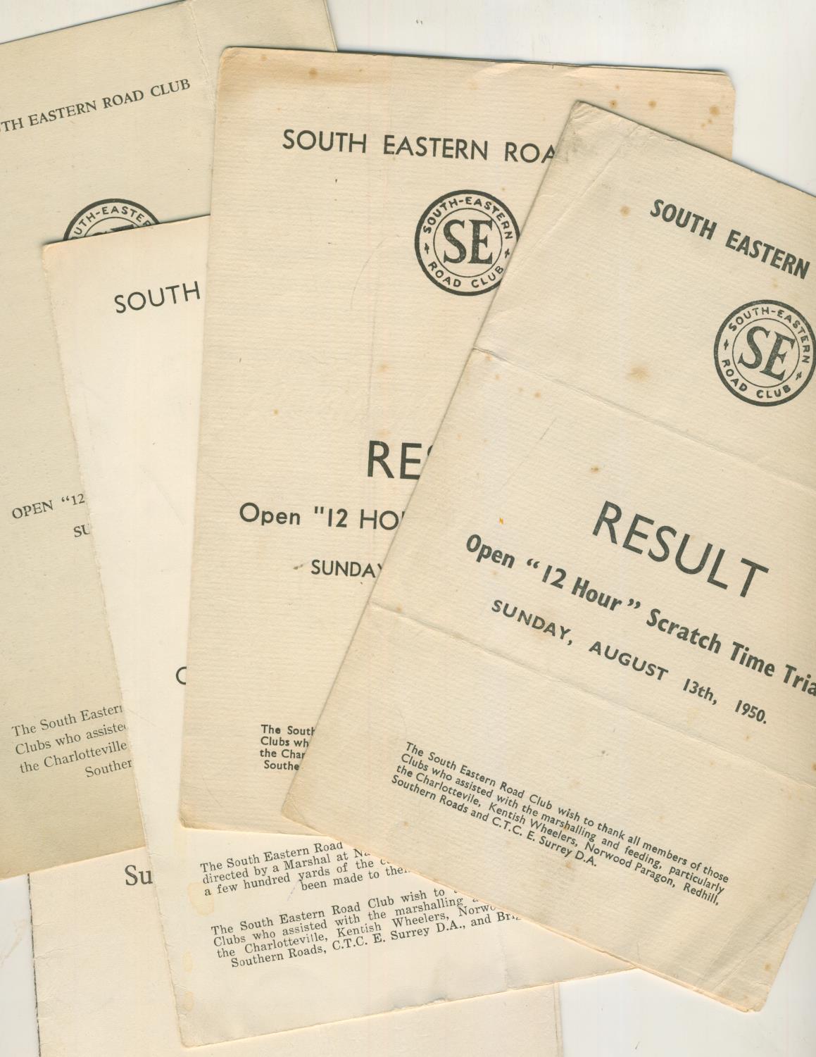 Five official results cards for the Open "12 Hour" Time Trials held by the South Eastern Road Club, Croydon, for 1950, 1951, 1952, 1953 and 1956.