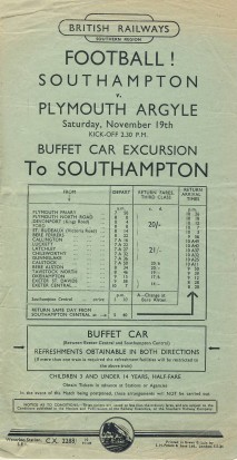 British Railways (Southern Region) handbill, advertising return trips from Plymouth to Exeter and thence a Buffet Car Excursion to Southampton. This was to transport fans to the game between Southampton and Plymouth Argyle on November 19th 1949.