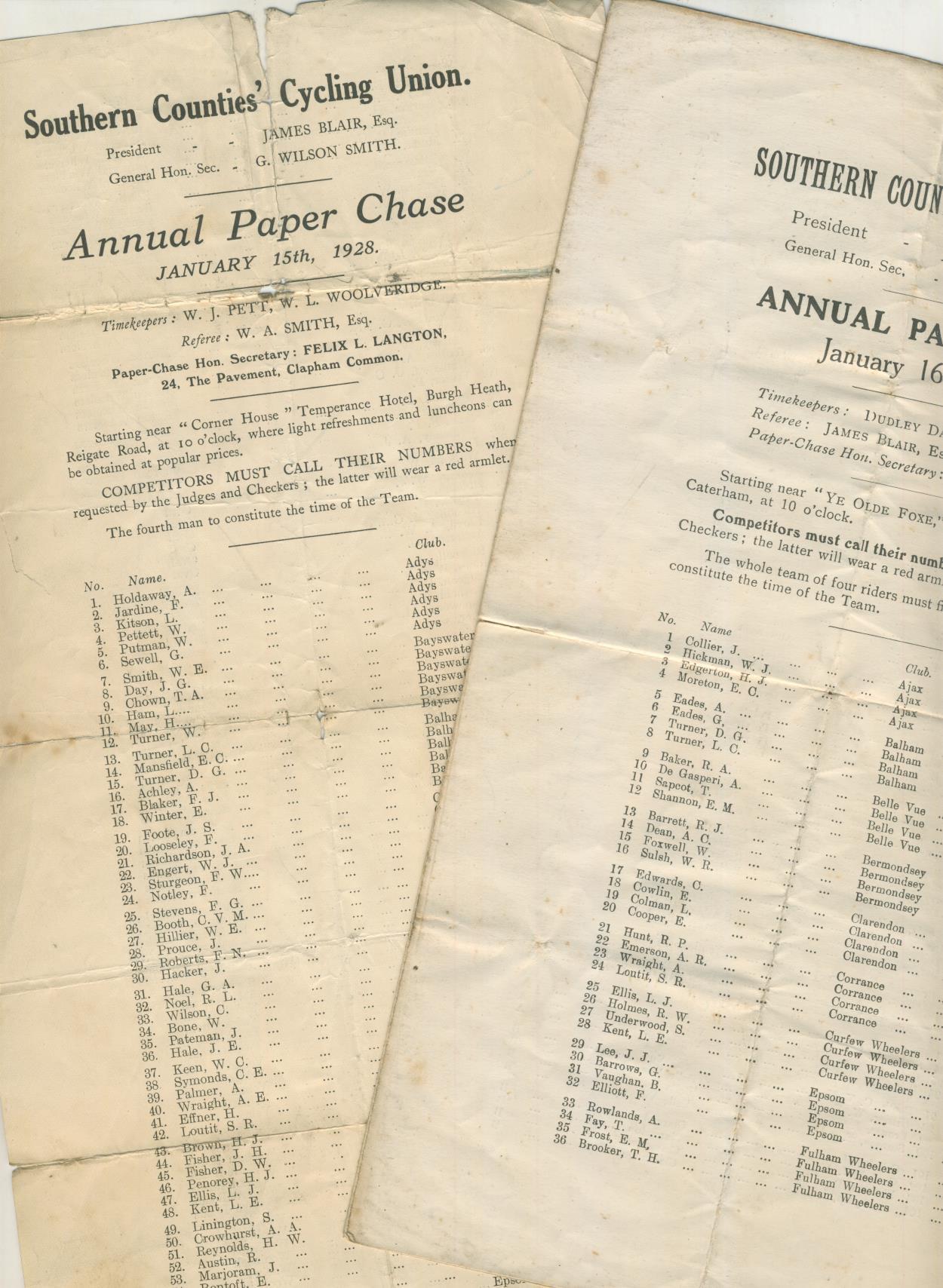 Official programmes, with lists of starters, for the Annual Paper Chase held by the Southern Counties Cycling Union on January 16th 1927 and January 15th 1928. The great Frank Southall of Norwood Paragon CC competed in the 1928 event.