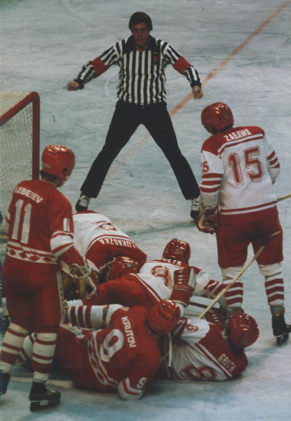 Original colour photograph showing action during the match between the Soviet Union and Poland, played on February 16th, 1980. The USSR won the match 8-1 and went on to win the silver medal.