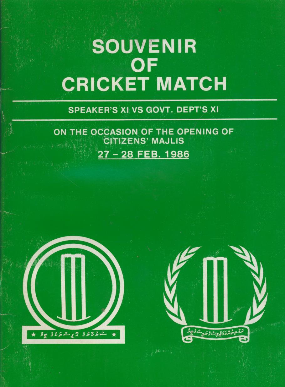 SPEAKER'S XI VS GOVT. DEPT'S XI (MALDIVES) 1986 CRICKET PROGRAMME