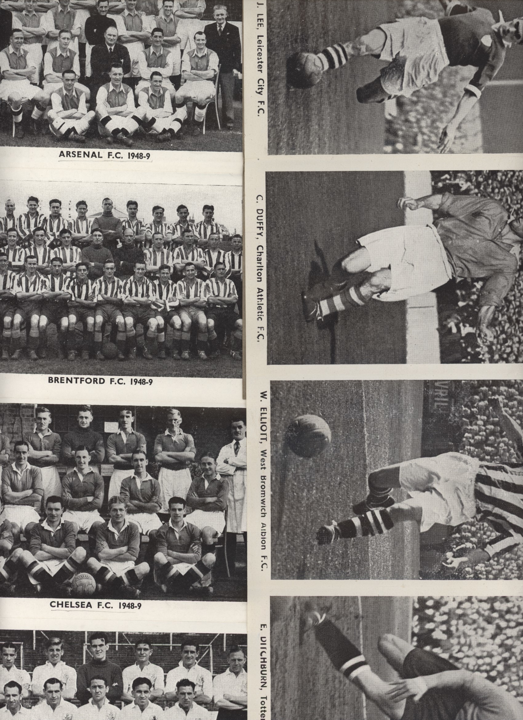 Thirteen examples from the Sporting Mirror's series of fold-out photographs designed for mailing, each featuring six or more images of players and teams, with this group comprising nos.1-5 and 8-15 which include Arsenal, Brentford, Chelsea, Fulham, Spurs, Everton and Liverpool group shots, plus portraits of stars such as Lawton, Mercer, Matthews, Bentley, Soo and Finney, along with numerous others.