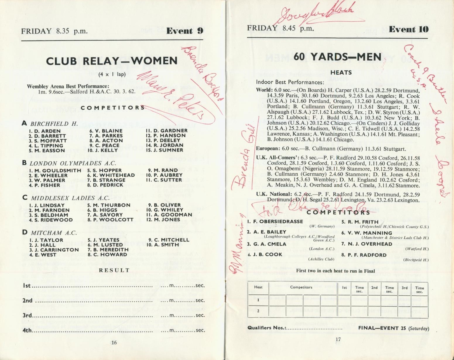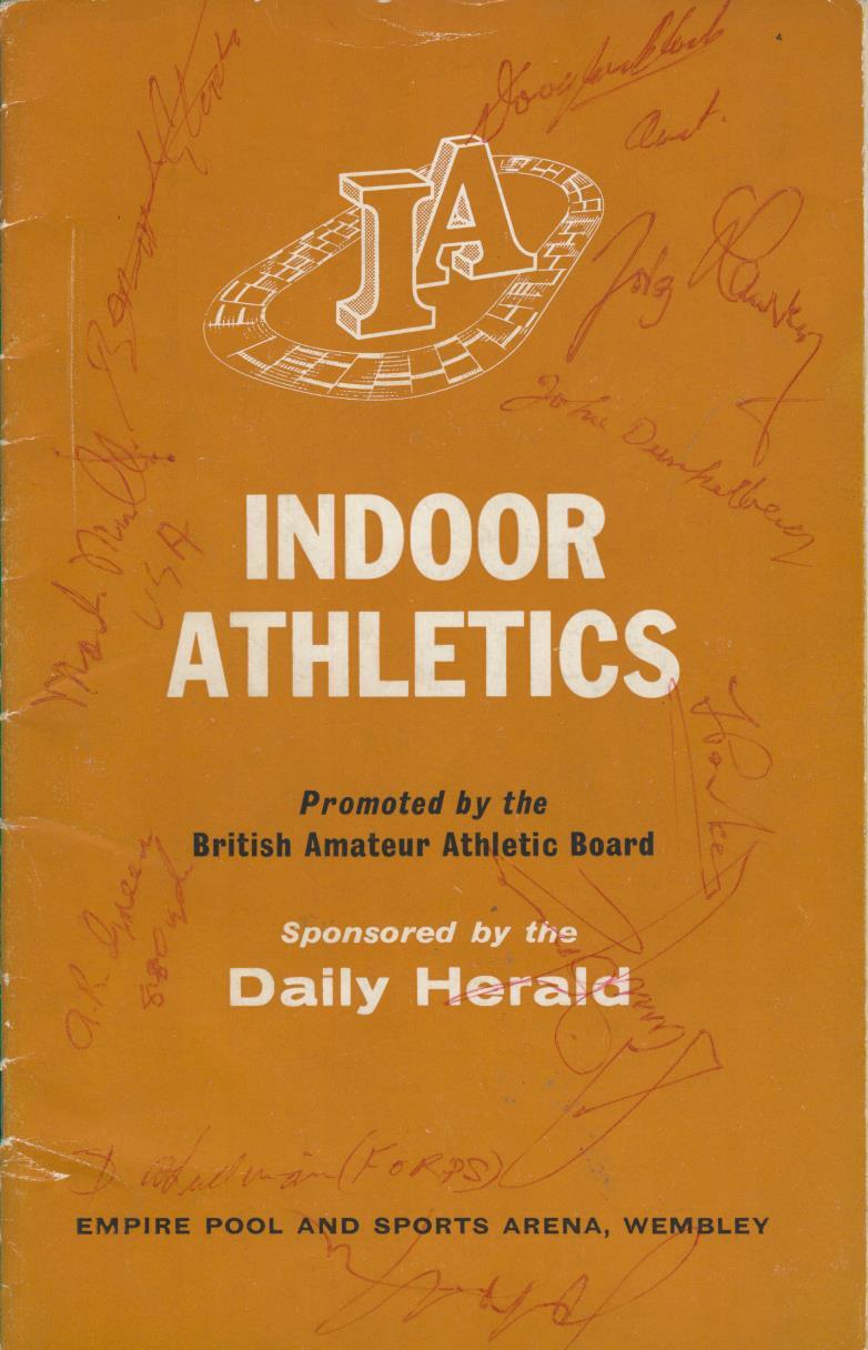 Official programme for the Indoor Athletics meeting, held at Wembley Empire Pool and Sports Arena on April 19-20, 1963. Competitors from GB, Ireland, Finland, Poland, USA and West Germany took part. Signed to front and throughout the programme by 29 competitors, including Mary Peters, John Thomas (US high jumper), Obersiedrasse, John Williams, Daphne Arden, Brenda Gill, Sheila Cooper, Hill-Cottingham and Zimny.