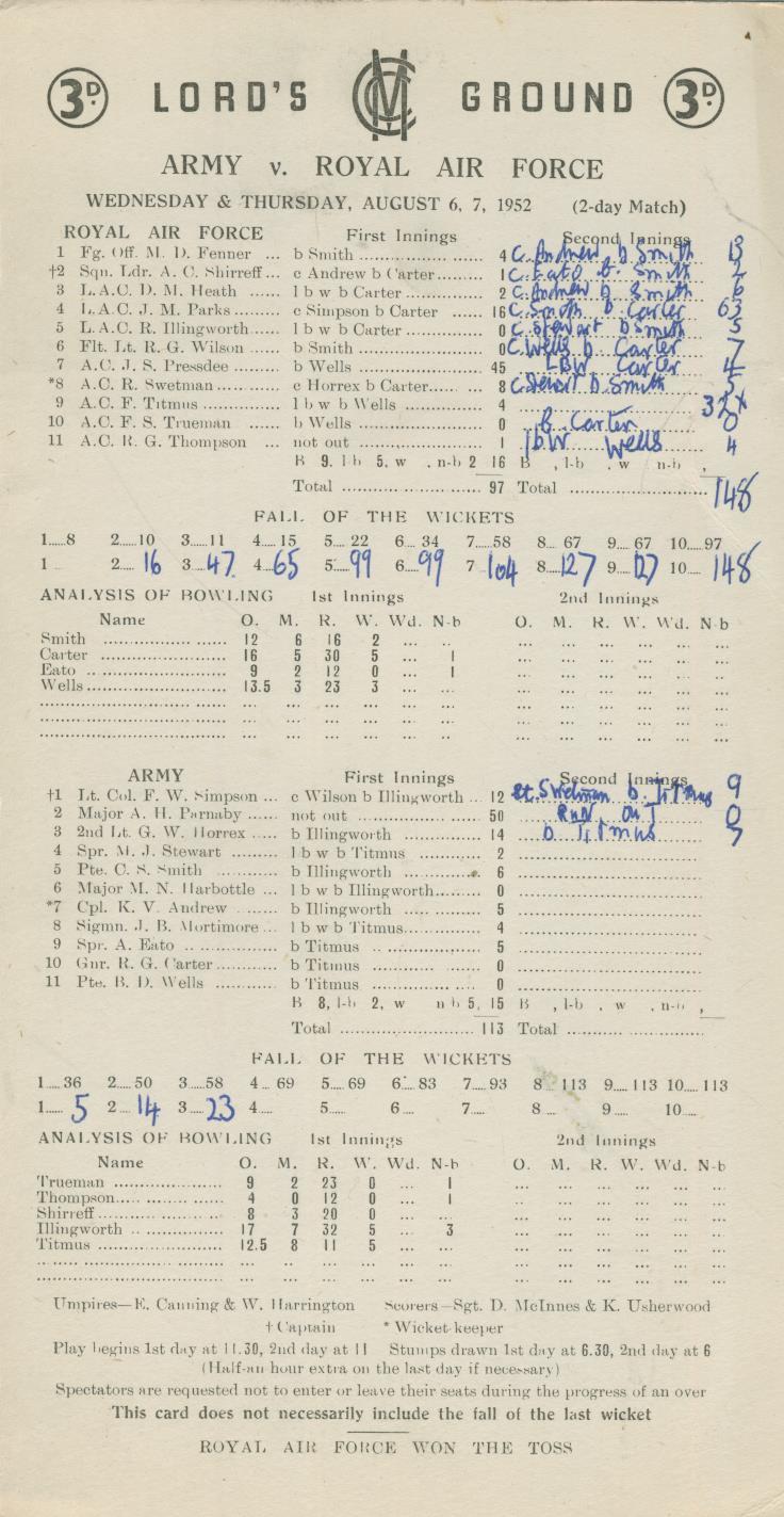 Cricket » Cricket Scorecards » Representative Teams » ARMY V ROYAL AIR FORCE 1952 CRICKET SCORECARD