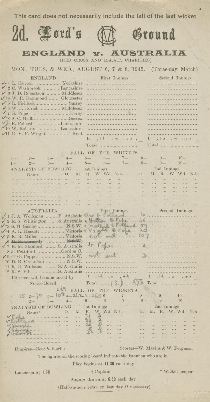 ENGLAND V AUSTRALIA 1945 CRICKET SCORECARD
