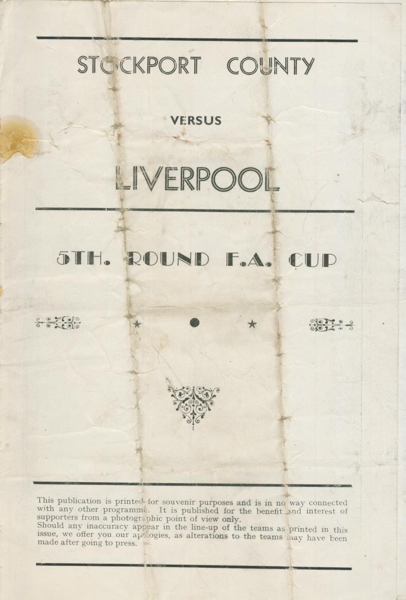 STOCKPORT COUNTY V LIVERPOOL 1949-50 SOUVENIR FOOTBALL PROGRAMME
