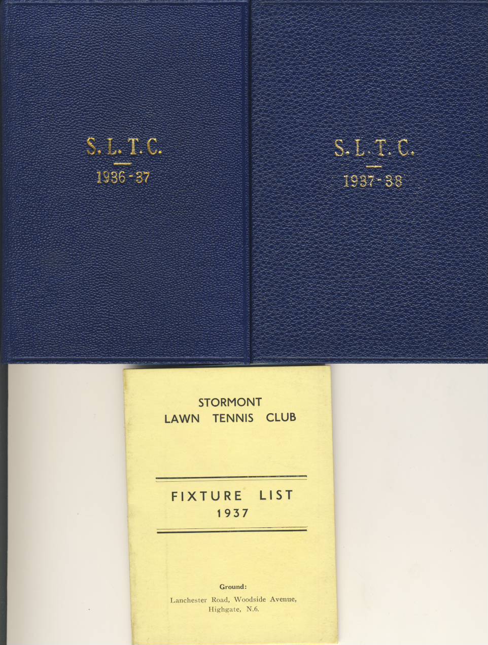 Two handbooks for the Stormont Lawn Tennis Club, Highgate, 1936-37 and 1937-38. Contains lists of officers, members and rules. Also comes with a fixture list for 1937, with matches against Primrose, Ravens, Kenwood, Woodside Park and Friern Barnet, to name a few.