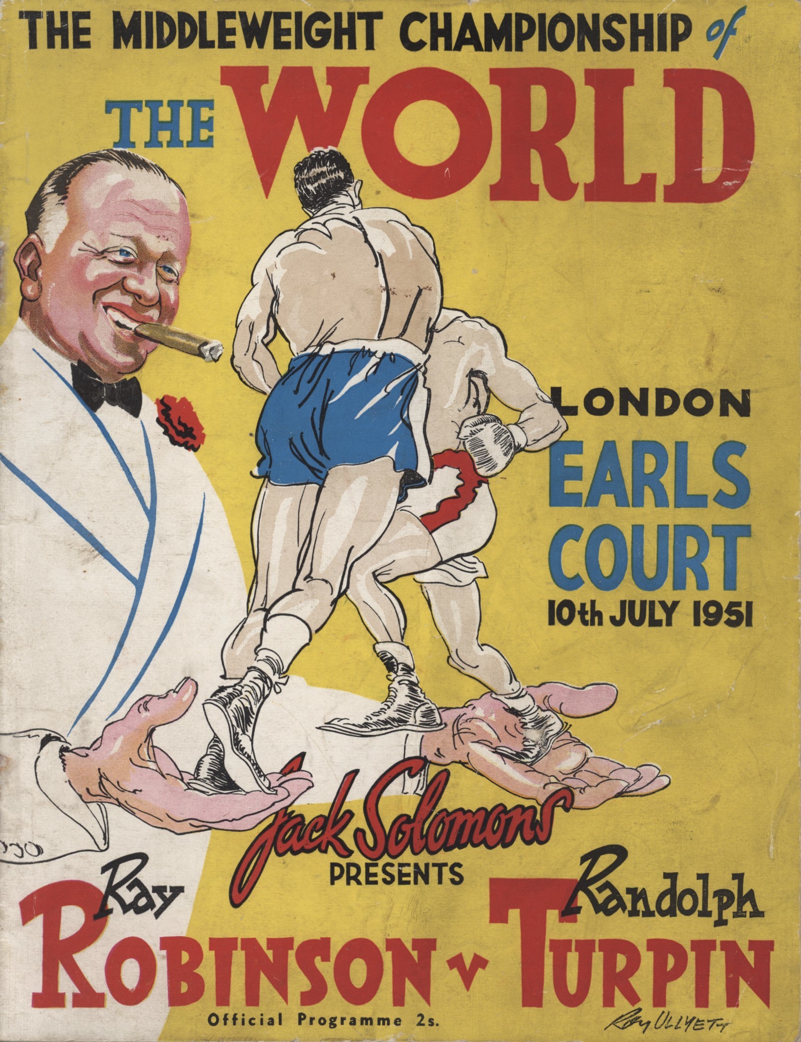 Official programme for the world middleweight title fight between Robinson and Turpin at Earls Court, 10th July 1951. In one of the great sporting upsets, Turpin outfought the hitherto invincible Sugar Ray to win the world title.