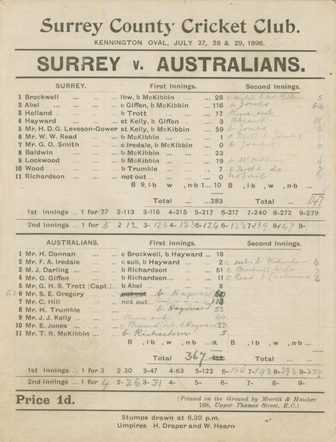 SURREY V AUSTRALIANS 1896 CRICKET SCORECARD