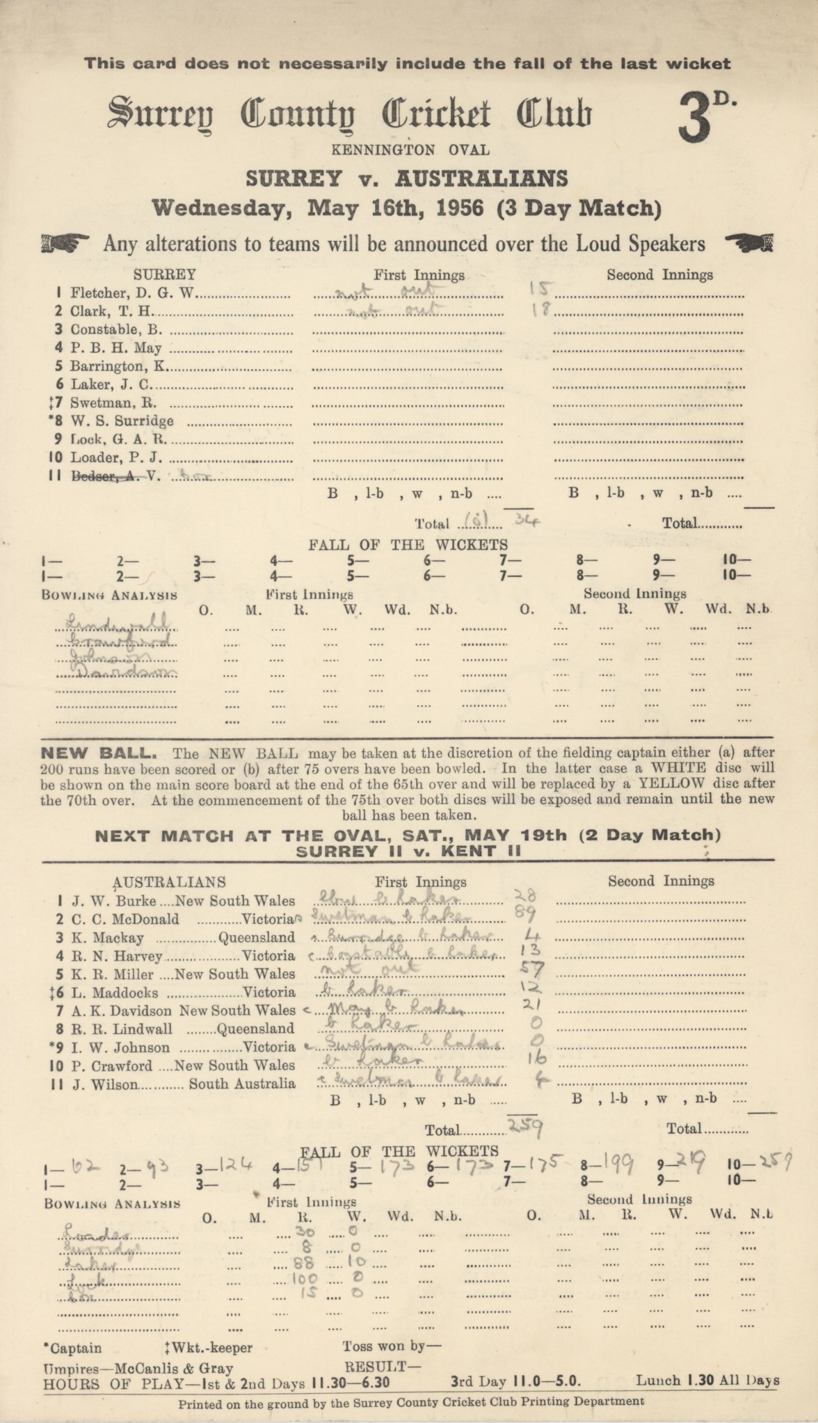 SURREY V AUSTRALIANS 1956 (LAKER 10 WICKETS) CRICKET SCORECARD