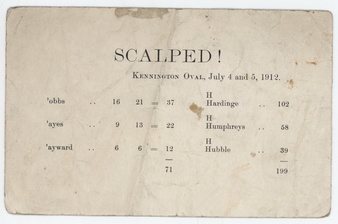 Original cricket postcard published (probably in Kent) to celebrate Kent winning the match at the Oval on July 4-5, 1912, by 9 wickets. The card is titled "Scalped!" and records the match scores of the three famous Surrey "H's" ('obbs, 'ayes and 'ayward) with the Kent "H's" Hardinge, Humphreys and Hubble. The Surrey threesome scored 71 runs in total over two innings, whereas the Kent stars scored 199 in just one innings.