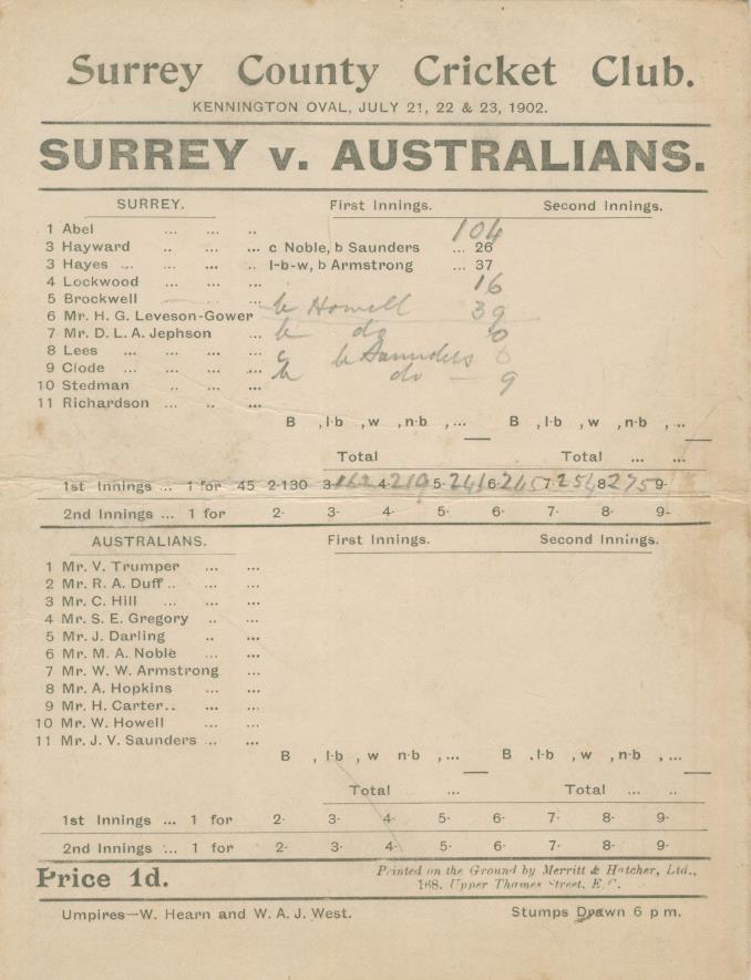 SURREY V AUSTRALIANS 1902 CRICKET SCORECARD