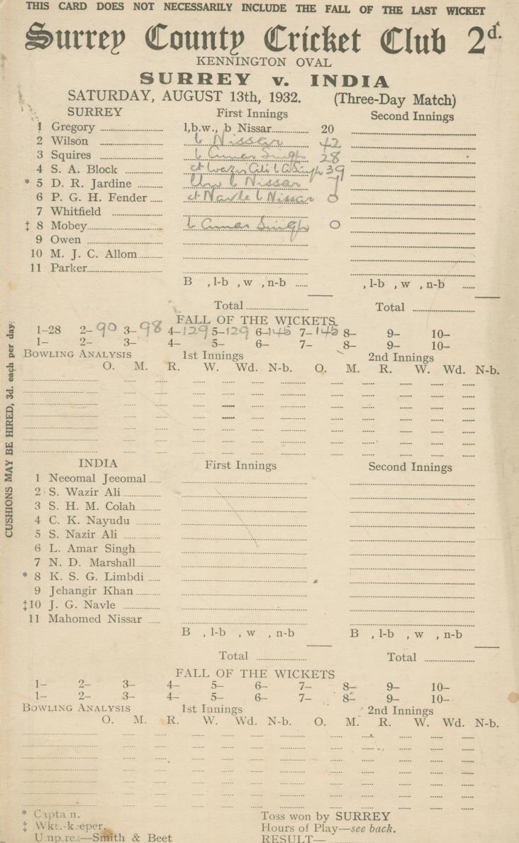 SURREY V INDIA 1932 (OVAL) CRICKET SCORECARD