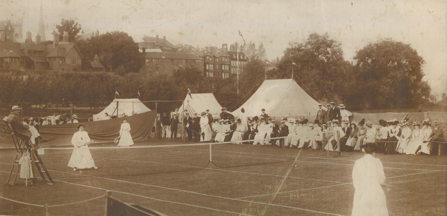 Original sepia photograph of a ladies doubles match at the Severnside Tennis Club in Shrewsbury, taken in 1907. The players are noted on the reverse as Granny Alltree, Bettye and Madeline.