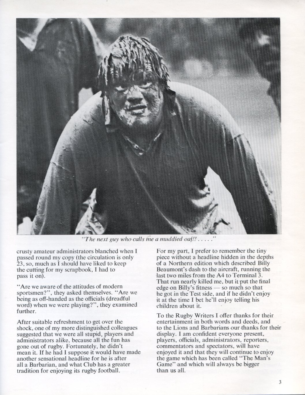 The official commemorative booklet from the Rugby Union Writers' Club luncheon held to pay tribute to the Lions tour of New Zealand and the Lions' Jubilee Celebration match against the Barbarians at Twickenham on the 10th of September 1977. The Luncheon was held at the Excelsior hotel, Heathrow on Sunday 11th September 1997.