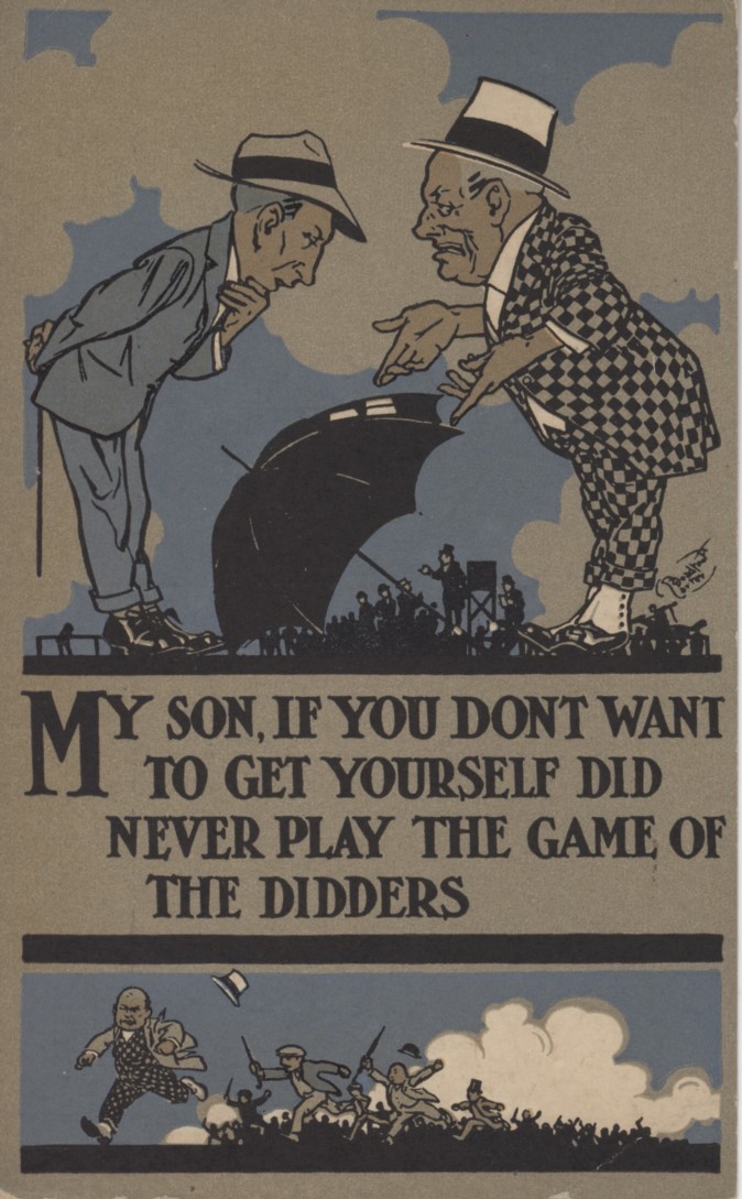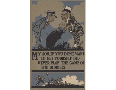 Postcard from the 'Motto Series', this example warning against the perils of racetrack gambling: "My son, if you don't want to get yourself did never play the game of the didders'. Designed by the noted illustrator David Broadfoot Carter (1880-1940), who studied at the Glasgow School of Art in its heyday.
