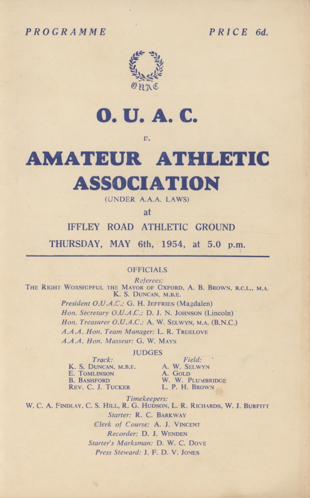 Original programme for the athletics meeting between the Oxford University Athletics Club and the A.A.A. , held at Iffley Road Athletic Ground on May 6th, 1954. The occasion is, of course, famous for Roger Bannister breaking the 4 minute barrier for the mile, the first time that this feat was achieved.