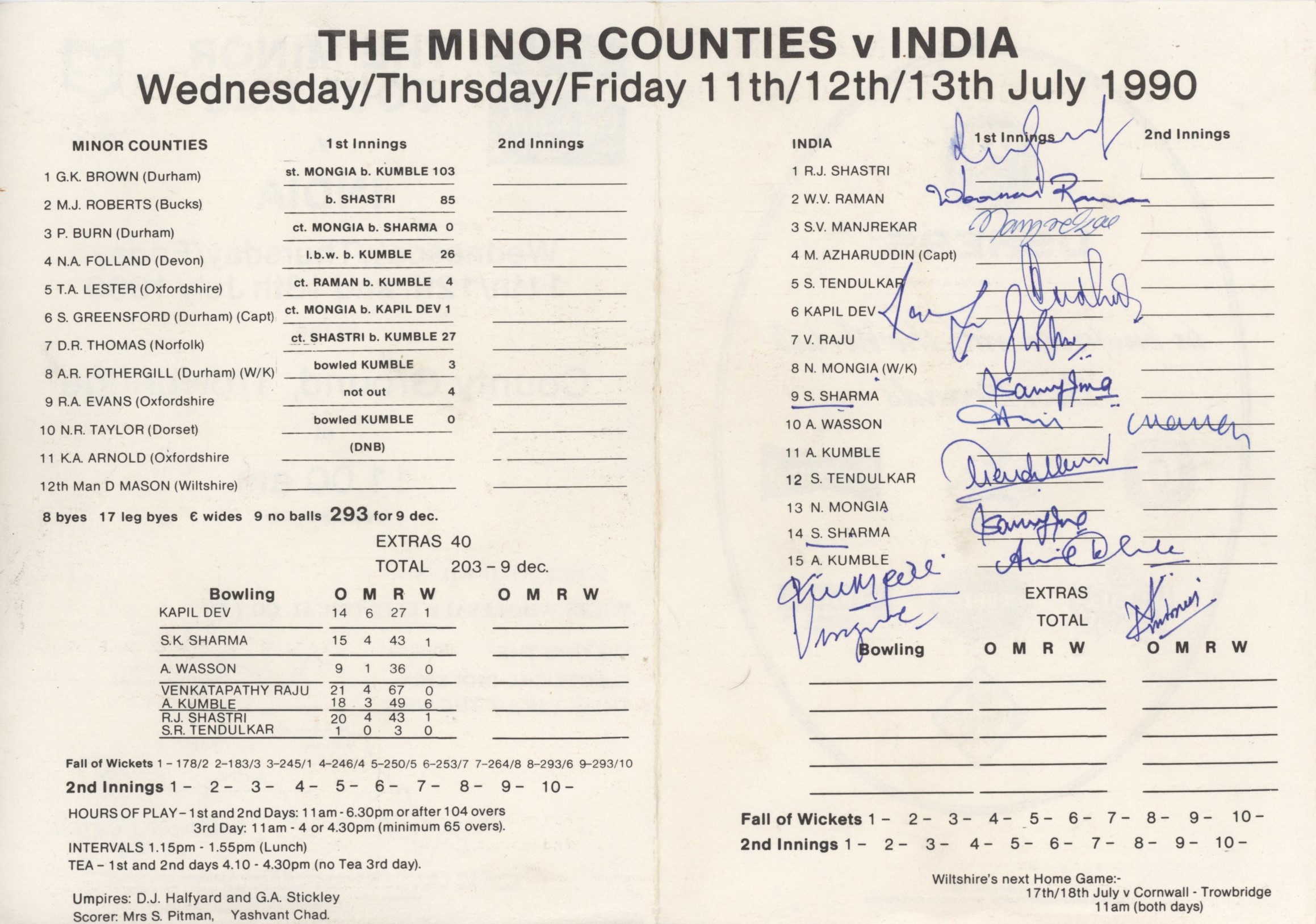 Cricket » Cricket Scorecards » Minor Counties/Clubs » MINOR COUNTIES V INDIA 1990 (TROWBRIDGE) CRICKET SCORECARD - SIGNED BY INDIA