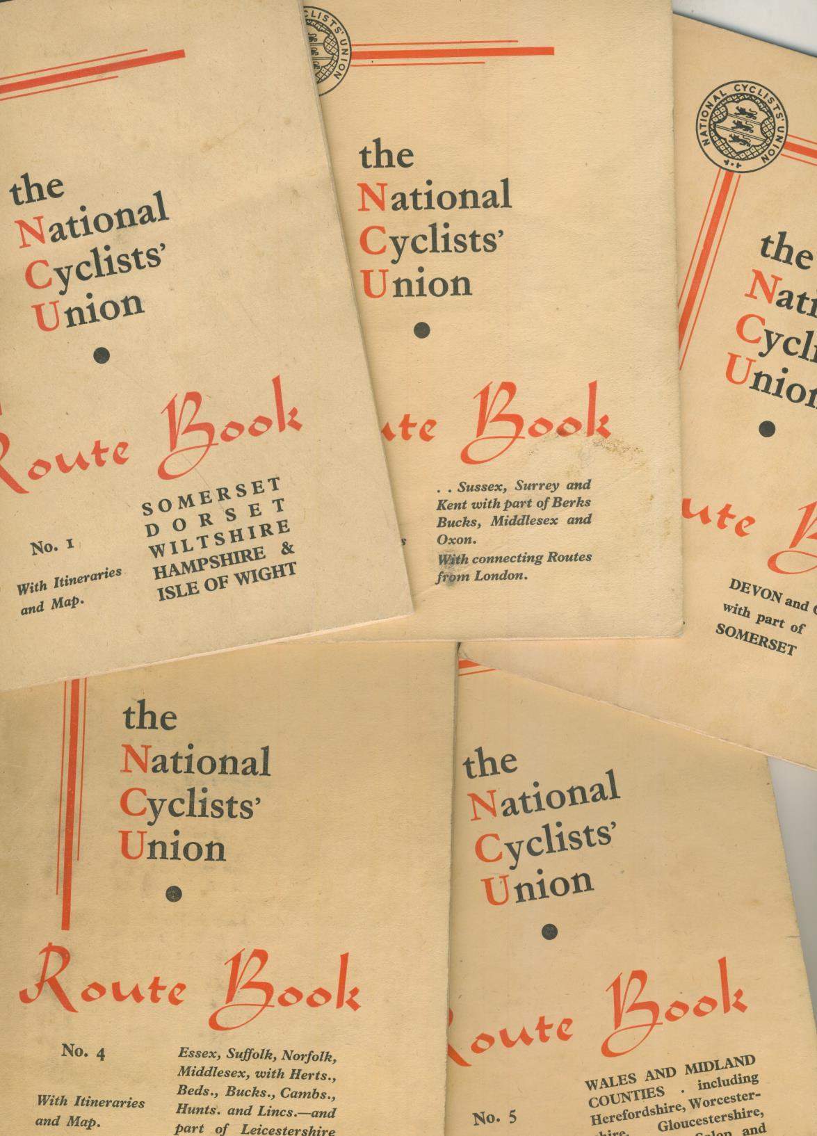 Set of 5 route books published by The National Cyclists' Union in the early 1950s. All counties from the Midlands southwards are covered with maps, planned routes, distances etc.