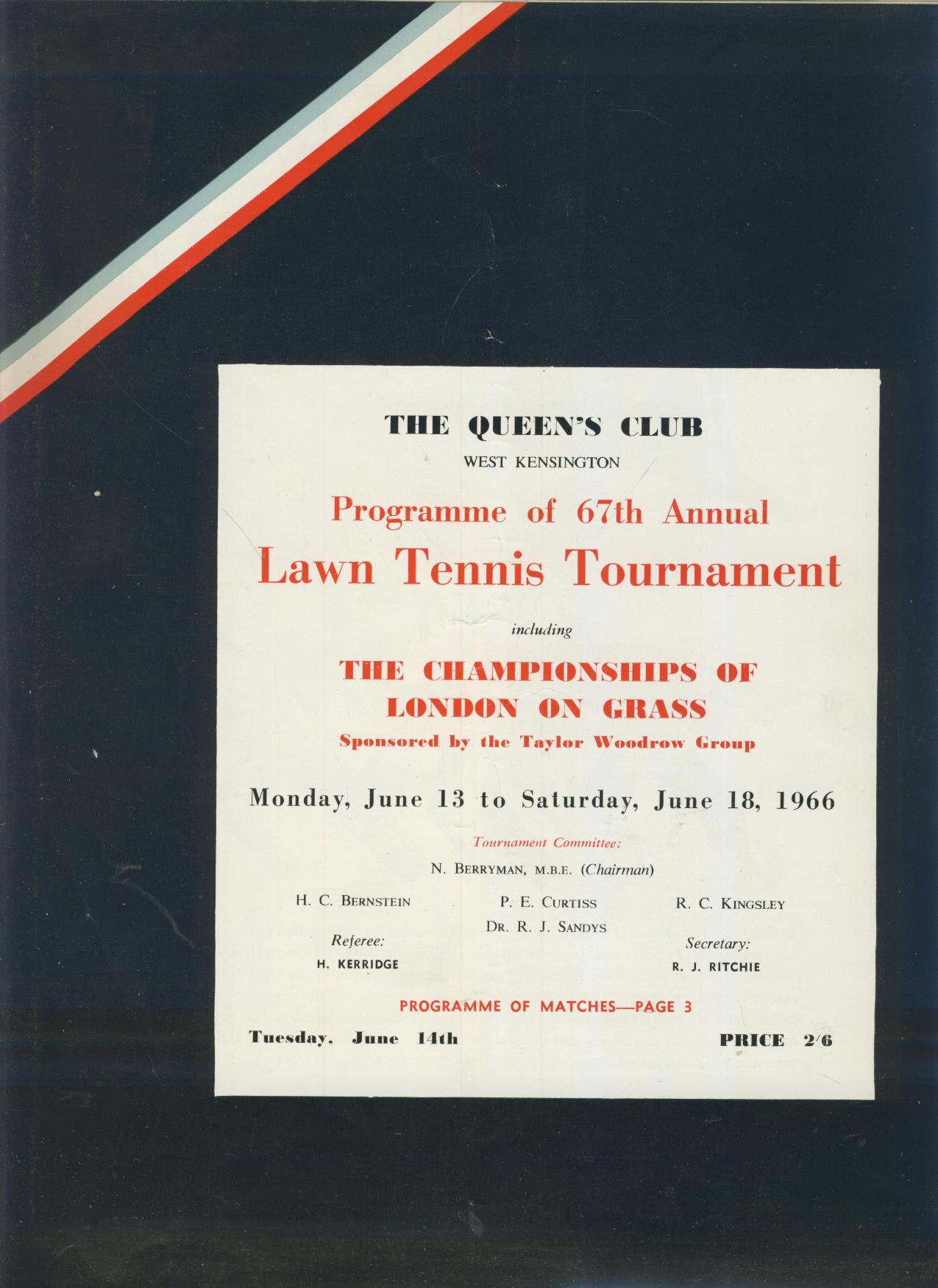 Programme for the 67th Annual Lawn Tennis Tournament at Queen's, 13-18 June 1966. This programme was for June 14th.